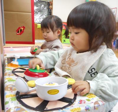 食べ物を入れたフライパンやお鍋をコンロの上に置いたり、保育士が「いってらっしゃ~い」と声を掛けると、小さなバックに食べ物を入れ、手を振る仕草をして出掛けたり、保育士が「おかえり~」と言うと、バックの中から食べ物を出して食べさせてくれたり・・・見立て遊びを楽しんでいます🐱